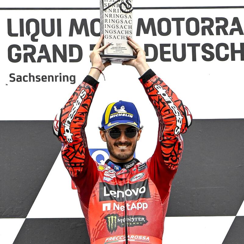 Al sabato aveva detto: "Il podio oggi va bene ma domenica possiamo fare la differenza". Pecco Bagnaia nella gara domenicale del Sachsenring non ha fatto la differenza ma si è comunque riportato vicinissimo a Jorge Martin, precisamente a mezzo secondo di distanza al 29° di 30 giri.