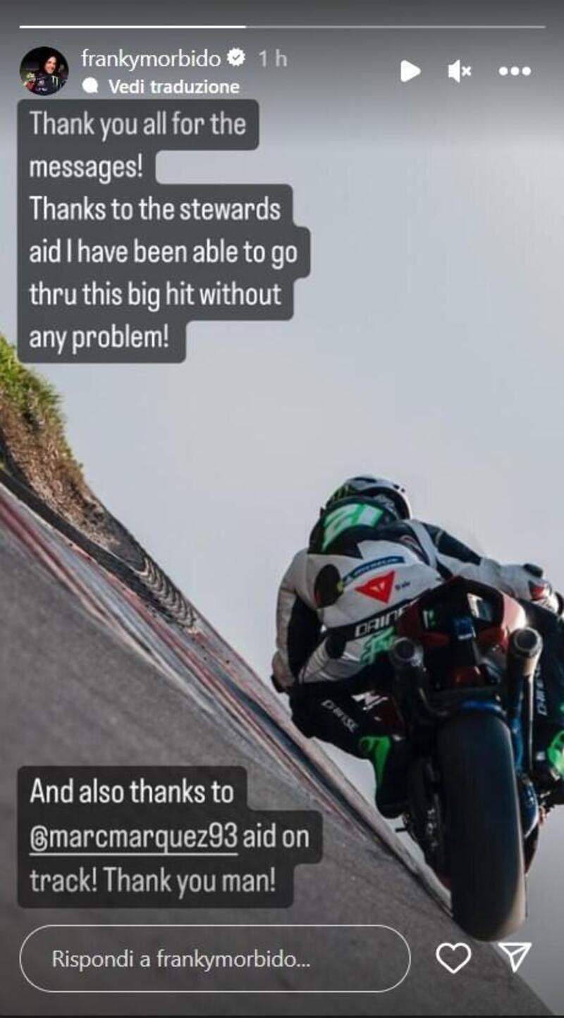 Nella mattina di giovedì Morbidelli ha pubblicato una storia in cui ha ringraziato gli appassionati, gli steward e anche Marc Marquez che è stato il primo a soccorrerlo (vedi foto sotto).