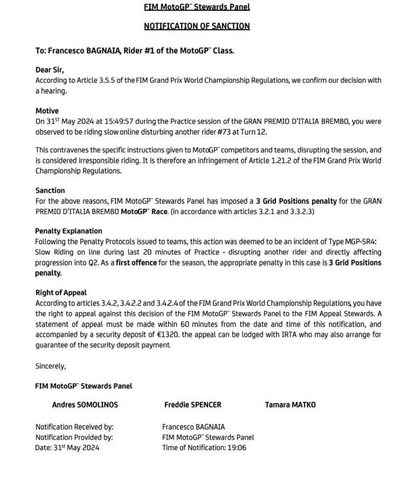 Quindi: "Per i motivi sopra indicati, lo Steward panel della FIM MotoGP ha imposto una penalità di 3 posizioni in griglia per la Gara (e non per la Sprint, ndr)".