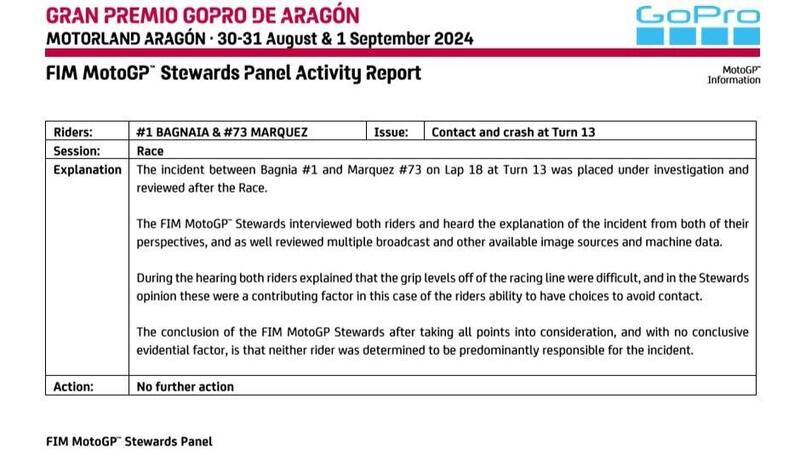 "L'incidente tra Bagnaia e Marquez al giro 18, alla curva 13, è stato messo sotto indagine e rivisto dopo la gara. Gli Steward della FIM MotoGP hanno intervistato entrambi i piloti e hanno ascoltato la spiegazione dell'incidente da entrambi i loro punti di vista, oltre a esaminare molteplici trasmissioni e altre fonti di immagini e dati disponibili.