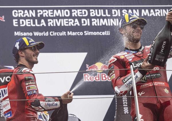 Il cielo cupo di Misano concede la vittoria a Marc Marquez: la back-to-back Aragon-San Marino è tutta del numero 93 e ora non vorrà certo fermarsi. La pioggia ha così rovinato i piani di Pecco Bagnaia, in testa i primi giri della gara e secondo al traguardo, e quelli di Jorge Martin, quindicesimo per un pesante errore di valutazione. Sale sul podio davanti al pubblico comunque in festa anche Enea Bastianini.