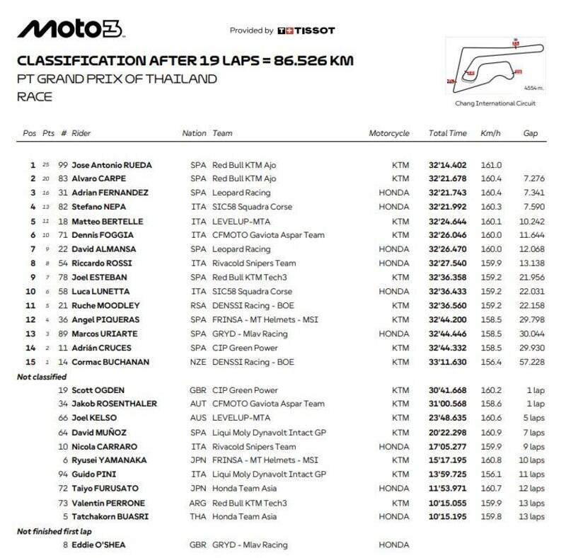Una gara ad eliminazione. A vedere il traguardo nel primo atto della Moto3 a Buriram sono stati solo 15 piloti su 26. Tanti i colpi di scena, mentre una conferma viene al team KTM Ajo e dalla sua fabbrica di talenti. L'anno si apre sotto il segno di José Antonio Rueda: lo spagnolo, già velocissimo durante tutti i test, conquista così la sua seconda vittoria in carriera, ottenuta in solitaria con ben 7 secondi di vantaggio su tutti gli altri piloti.