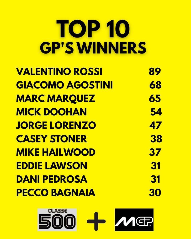 - Valentino Rossi: il 46 merita un'annotazione a parte. È di gran lunga il più longevo con 372 GP disputati nella classe regina, 22 stagioni. Nessuno gli si avvicina. Lui più volte ha detto che avrebbe continuato fino-a-che-si-sarebbe-divertito e non gliene sarebbe importato niente, zero, di smettere quando era ancora all'apice. Questo, giocoforza, ha abbassato le sue percentuali, su vittorie e podi specialmente. Nelle classifiche percentuali relative alla sola MotoGP il 46 non c'è mai