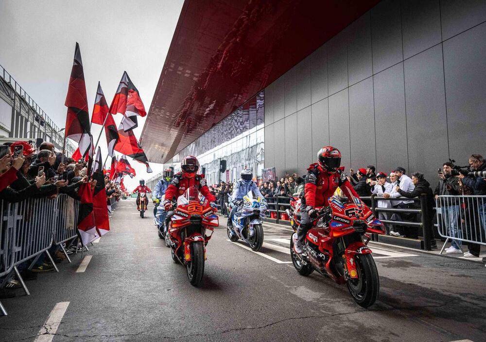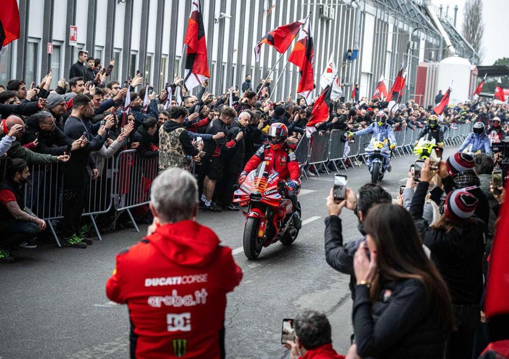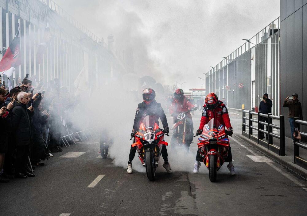 Al mattino, nella conferenza di celebrazione hanno parlato diversi protagonisti: Domenicali ha anche ricordato che il 2026 segna il centenario di Ducati. Invece Dall'Igna ha parlato anche di Superbike: "Non abbiamo perso mondiale Sbk per colpa di Nicolò ma per qualche stop della nostra moto, quindi colpa mia" ha detto il dg.