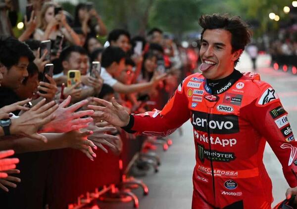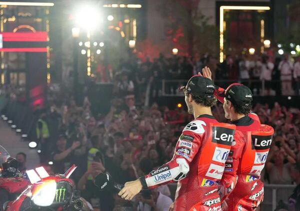 Infine i piloti sono saliti su moto stradali e hanno percorso alcune vie fino a raggiungere un palco allestito all’aperto. Lì hanno parlato i piloti e il pubblico ha potuto sentire il suono dei motori delle varie MotoGP.