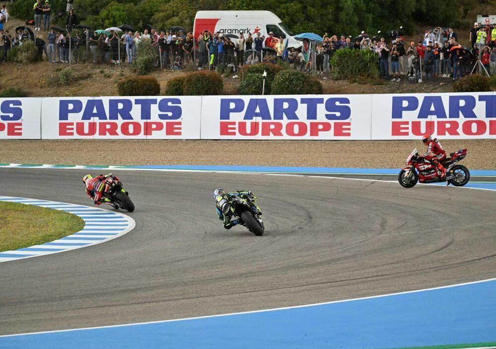 "Domani sarà una giornata più normale. Oggi è stata una di quelle giornate, come hai detto, turbolente, in cui abbiamo dovuto cavalcare le onde, gestire la gara al meglio, e ci siamo riusciti in Q2 e nello sprint. Domani sarà una giornata normale, e in una giornata normale abbiamo visto che in tre giri Álex mi ha raggiunto e superato. Ieri era più veloce di almeno tre o quattro decimi di secondo, quindi domani dobbiamo capirlo, non farci trasportare dall'euforia di Jerez e dalla vittoria di oggi. Dobbiamo partire bene e dare il 100%, ma sappiamo che c'è Álex, prima di tutto, e poi Di Giannantonio e Bezzecchi, che sono un passo avanti a noi, ma cercheremo di soffrire e difenderci"
