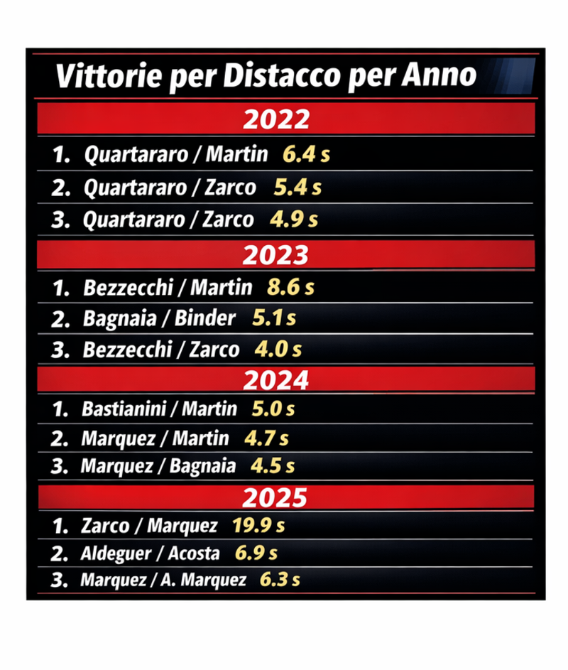 Le gare dal 2022 a oggi terminate con oltre 4 secondi di vantaggio del vincitore sul secondo sono 17.