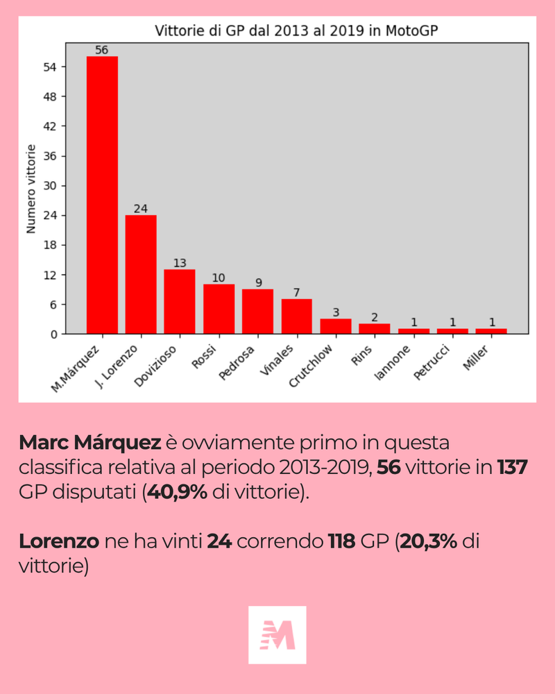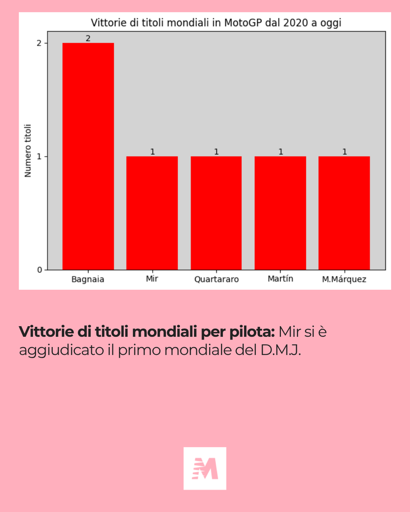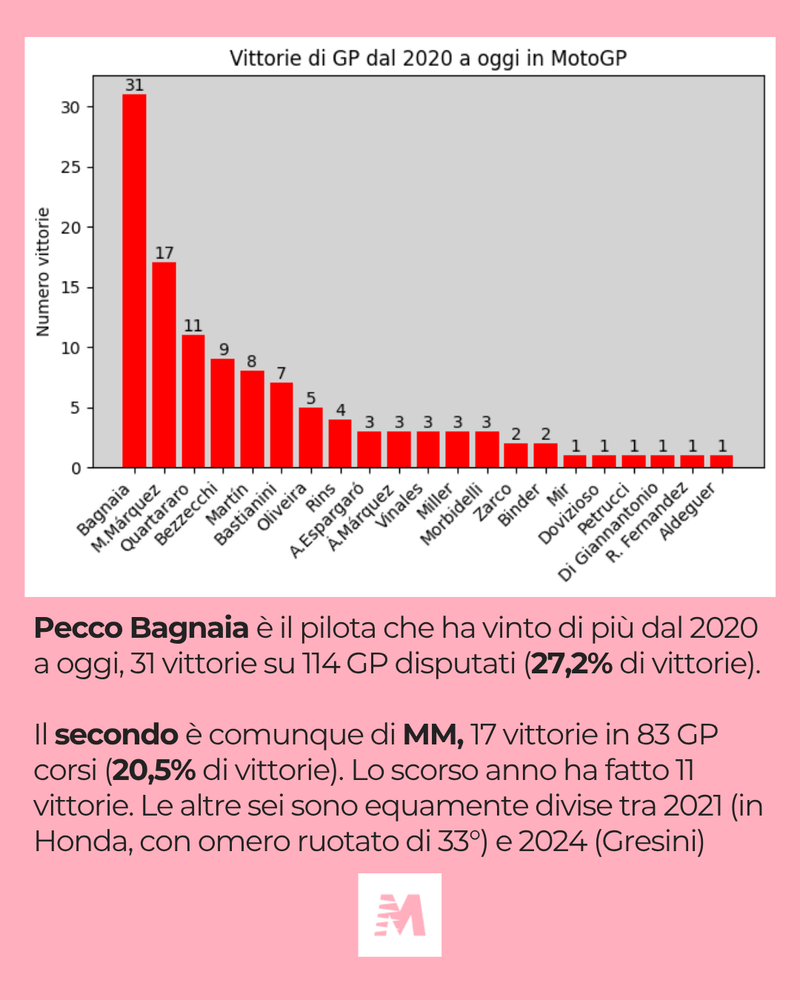 I numeri parlano chiaro: tra questi 5 piloti Pecco Bagnaia è stato il più vincente con 31 GP e 2 mondiali vinti. Più vincente, ma non dominante.