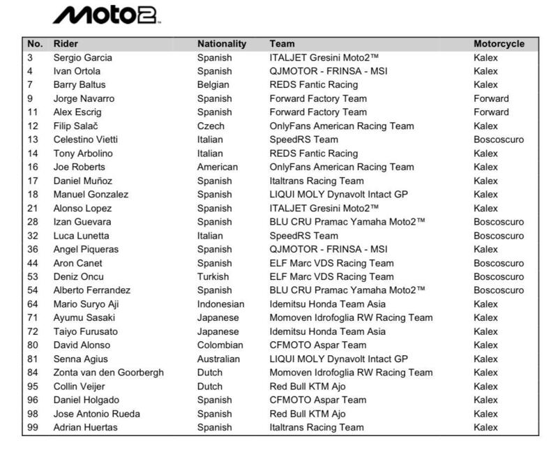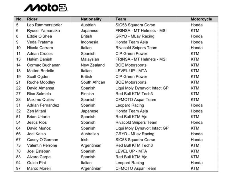 Sono state ufficialmente rese note le entry list dei piloti per le tre categorie del Motomondiale: Moto3, Moto2 e MotoGP.