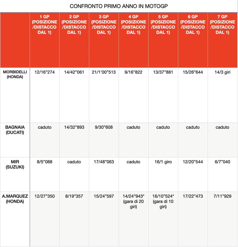 Mettiamo a confronto i risultati ottenuti da Alex Márquez nelle prime sette gare con quelli di Franco Morbidelli, Pecco Bagnaia e Joan Mir al primo anno in MotoGP. Ricordiamo che Morbidelli guidava una Honda satellite, allora decisamente inferiore alla RC213V ufficiale; Bagnaia una Ducati più vecchia di un anno (del 2018); Mir una Suzuki ufficiale. Dalla tabella si vede chiaramente che le prestazioni di Márquez jr sono assolutamente in linea e paragonabili a quelli dei piloti che oggi vincono o, comunque, sono grandi protagonisti.