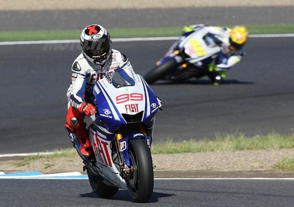 Il campione del mondo della Yamaha e il pilota spagnolo danno vita a una bagarre accesa, fatta di sorpassi e controsorpassi. Lorenzo è lontano, ma Rossi forza il ritmo per ottenere un buon piazzamento e ricucire il distacco in classifica generale da Stoner, in difficoltà sul tracciato giapponese.