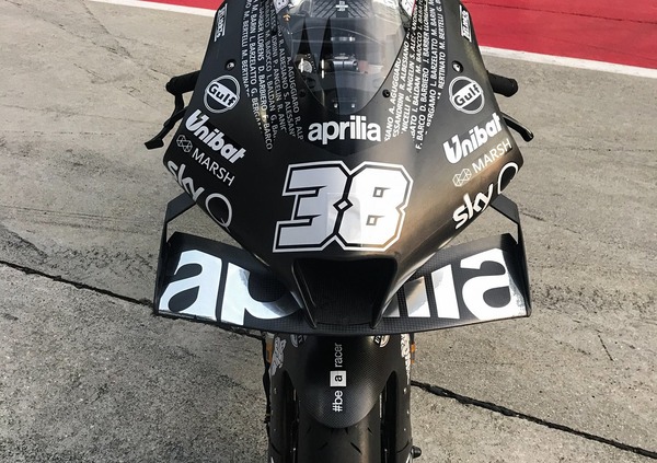 Subito sopra all'enorme appendice aerodinamica, il cupolino della moto il numero 38, quello del collaudatore ufficiale Bradley Smith che la guiderà a partire da domani e fino a martedì, mentre il secondo collaudatore per lo shakedown, Lorenzo Savadori, sarà sicurmente in sella alla RS-GP 19.