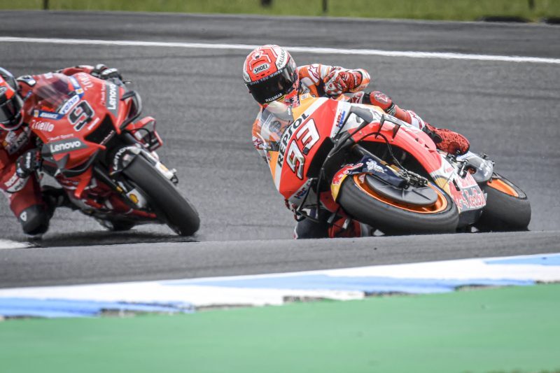 L’appendice vola via, Marquez procede verso il traguardo, chiudendo sesto. Bandiera a scacchi. I due proseguono verso la parte posteriore del circuito, dove si prova la partenza: Marc affianca Jorge, gli fa segni di stizza inequivocabili, poi con le mani mima chiaramente: “Stavi dormendo?”. Poi il (mezzo) chiarimento.