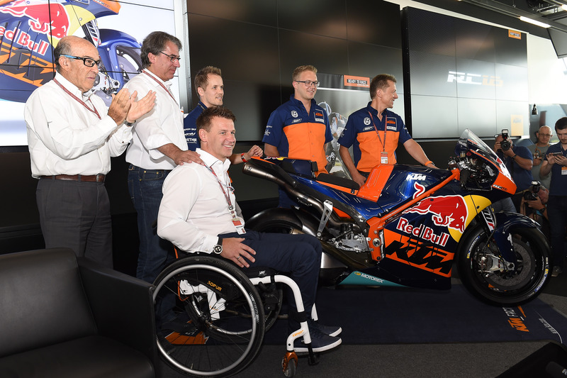 Dopo averla vista in tanti test privati, dopo averla vista in pista a luglio (qui in Austria), assieme agli altri team della MotoGP, sabato la KTM ha presentato ufficialmente la sua MotoGP, denominata RC16. Una presentazione naturalmente in pompa magna, dove non si è parlato di obiettivi, ma si è capito perfettamente che la Casa austriaca non entra in MotoGP solo per fare numero, come peraltro si è già visto in questa stagione, con una serie di test settimanali davvero impressionati. Il programma è al momento triennale (come minimo) e da qui alla wild card di Valencia con Mika Kallio, la KTM proverà a Misano, Aragon, Brno e Valencia. Per il momento, tutto è stato fatto per il meglio e viste quanto fatto dalla Casa austriaca in tutte le competizioni alle quali ha partecipato, c’è da scommettere che farà bene anche in MotoGP. Categoria, è bene ricordarlo, che ha messo in ginocchio colossi come Kawasaki, sta mettendo in difficoltà una Casa esperta come l’Aprilia, ha fatto venire i brividi alla BMW, che ha subito rinunciato alla possibilità di partecipare. Unico dubbio, la competitività dei piloti, visti anche gli ultimi risultati di Pol Espargaro e Bradley Smith con la Yamaha del team Tech3.
