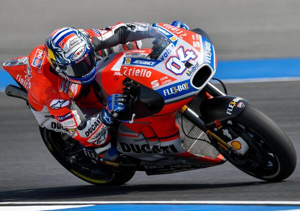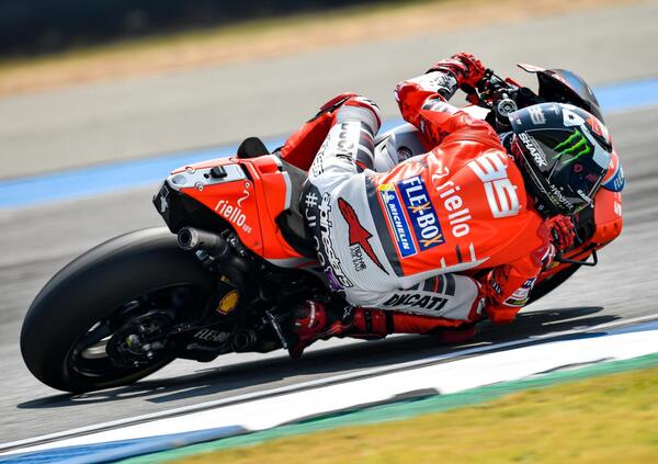 Ancora una volta, l’ingengere Gigi Dall’Igna ha studiato qualcosa di innovativo, con tre differenti profili alari che possono essere cambiati velocemente senza troppe difficoltà. Come era già avvenuto in Malesia, anche in Thailandia la Ducati è stata piuttosto efficace anche con Petrucci (sesto) e Miller (settimo e sempre tra i primi), mentre ha faticato di più Lorenzo, che solo nel finale si è avvicinato ai primi: un decimo posto che però non salva la giornata dello spagnolo, descritto anche piuttosto teso all’interno del box. Se non altro, l’ultima uscita è stata incoraggiante, con tre giri discreti: potrebbe essere la base di partenza per domani.