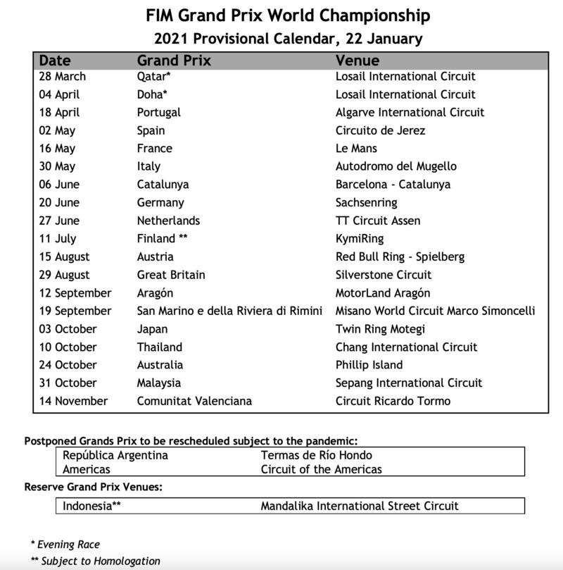 Come era prevedibile, purtroppo, il calendario 2021 subisce delle modifiche, anche se viene mantenuta la data inaugurale in Qatar il 28 marzo. A Losail si correrà per due settimane consecutive, perché, come era ampiamente previsto, i GP d’Argentina e degli Stati Uniti sono stati posticipati, per non dire cancellati: al momento, Dorna non vuole dire che non verranno effettuati, ma è molto probabile che anche quest’anno non si andrà né a Termas de Rio Hondo né ad Austin.