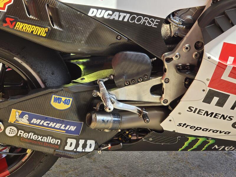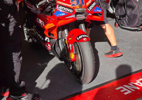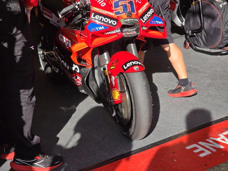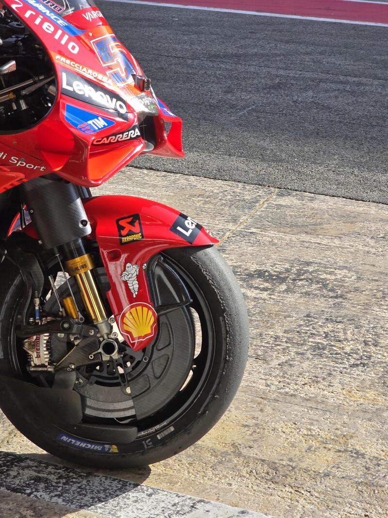 Ma quanto frena forte questa Ducati? Un’idea ce la si può fare osservando la dimensione del disco freno anteriore installato su un prototipo della GP25 che stava utilizzando il collaudatore Pirro. Tra disco in carbonio è cover di protezione, il disegno della ruota non si vede più.