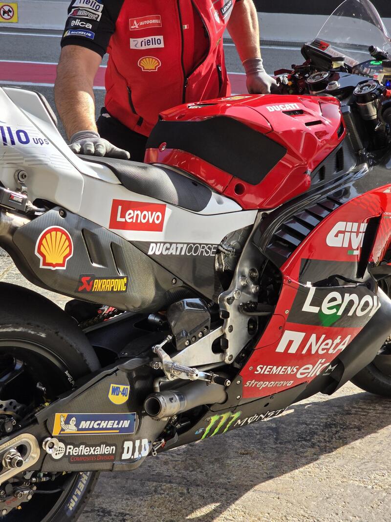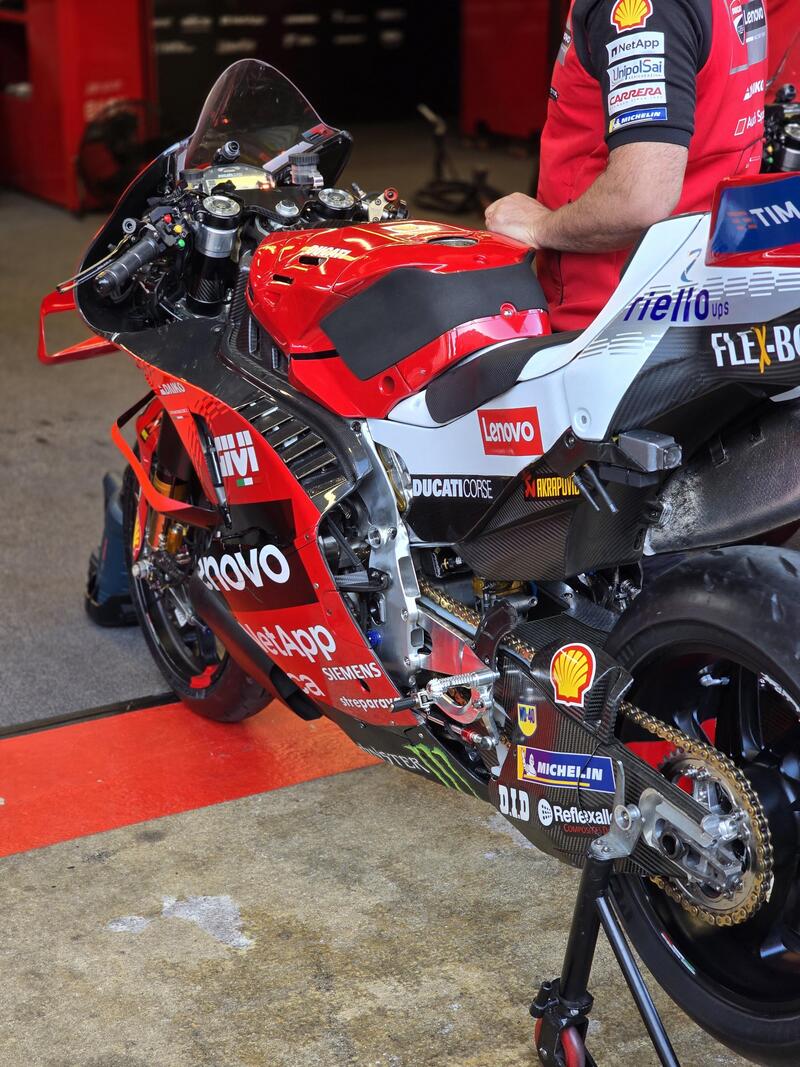 Questa prima foto mostra il prototipo della GP25 e fa vedere alcuni dettagli dell’evoluzione aerodinamica. La Desmosedici è sempre stata molto curata sotto questo punto di vista e dal 2015 ha portato al definitivo debutto le appendici alari applicate alla carenatura.