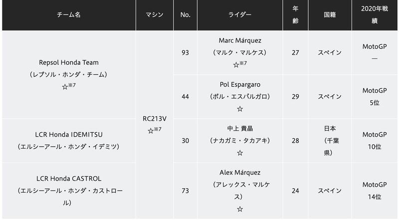 Non tutti questi campionati, e i team che vi si impegnano, godono dello status di ufficiali: lo schema è un'occasione per verificare (non è sempre chiaro) quali team, piloti e mezzi siano da considerarsi "Factory" e quali invece no. Non cambia moltissimo rispetto allo scorso anno, in realtà: i quattro piloti della MotoGP sono da considerarsi tutti ufficiali, dispongono di moto ufficiali (e Nakagami quest'anno dovrebbe avere, a differenza dell'anno scorso, un mezzo in linea con gli sviluppi dell'anno corrente) e sono tutti e quattro sotto contratto direttamente con HRC.