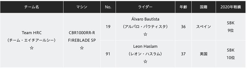 Qualche differenza emerge solo per la Superbike, dove il team ufficiale mantiene lo status di completo supporto (e anche in questo caso, sia Bautista che Haslam sono sotto contratto diretto HRC) mentre sparisce del tutto il team satellite MIE - Honda nato dall'unione degli sforzi fra Midori Moriwaki e Genesio Bevilacqua.