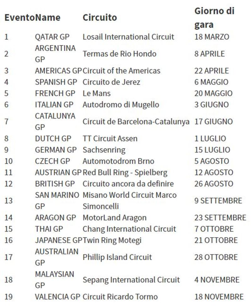 Non ci sono invece variazioni di rilievo per il resto del calendario, che ripropone le stesse prove con una collocazione grossomodo invariata. L'unica potenziale novità è relativa alla Gran Bretagna, il cui Gran Premio è ancora ufficialmente in cerca di un circuito sul quale correre. Dopo la prospettiva (sfumata) del Circuit of Wales, attualmente la diatriba è naturalmente fra Donington e Silverstone. Con ogni probabilità si tornerà comunque a Silverstone, nonostante le lamentele dei piloti sulla qualità dell'asfalto.