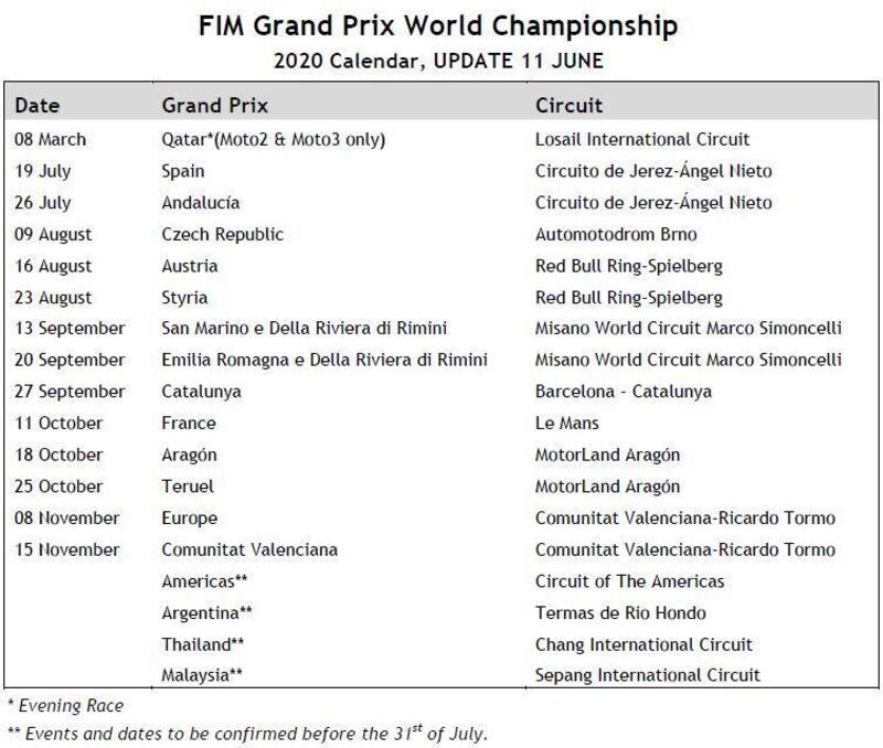 Tutto confermato, non ci sono novità rispetto a quanto preventivato negli ultimi giorni: al momento sono 13 le gare certe, tutte in Europa, con altri 4 GP extraeuropei da confermare, ma solo se ci sarà la possibilità di aprire le porte al pubblico.