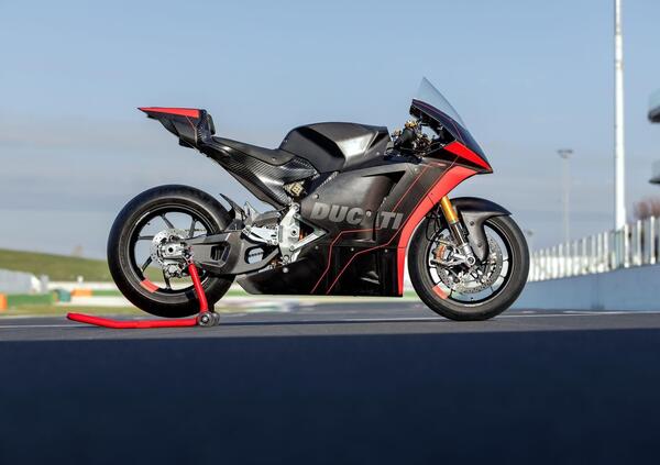 Bella come un'endotermica. Anzi, di più, perché la Ducati MotoE - il nome del prototipo è "V21L" - è più armonica della DesmosediciGP, troppo tecnica e funzionale per essere anche bella secondo i canoni tradizionali. Eccola qui, la moto che giovedì è stata impegnata nei test a Misano con Michele Pirro mentre Claudio Domenicali e Gigi Dall'Igna ne parlavano alla stampa.