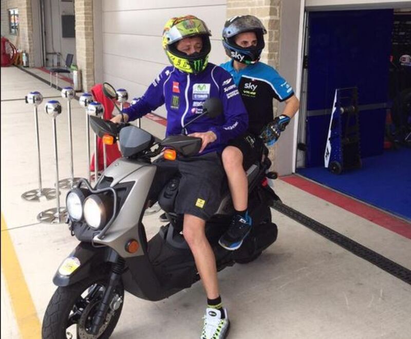 Giovedì pomeriggio, Valentino Rossi, come al solito, ha effettuato qualche giro di pista con lo scooter, come fanno tutti i piloti. Questa volta, però, Valentino ha caricato sul sellino posteriore Andrea Migno, pilota del team VR46, e al debutto su questo tracciato, per fargli vedere le traiettorie e svelargli qualche trucco: non male avere un maestro così…