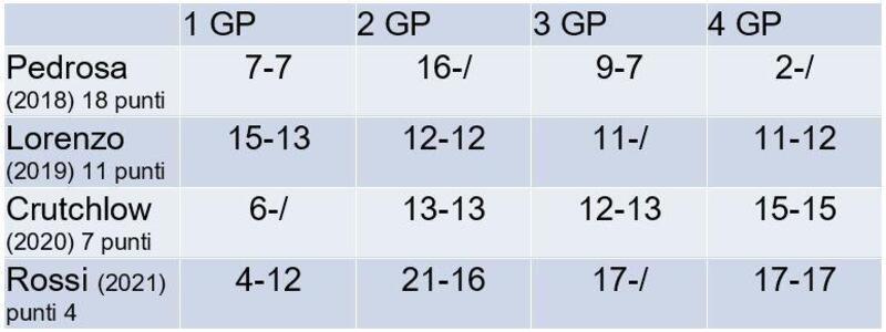 Negli ultimi tre anni, si sono ritirati tre piloti importanti come Dani Pedrosa (a fine 2018), Jorge Lorenzo (2019) e Cal Crutchlow (2020): nelle prime quattro gare disputate nelle rispettive stagioni, i risultati erano stati simili a quelli attuali di Rossi.