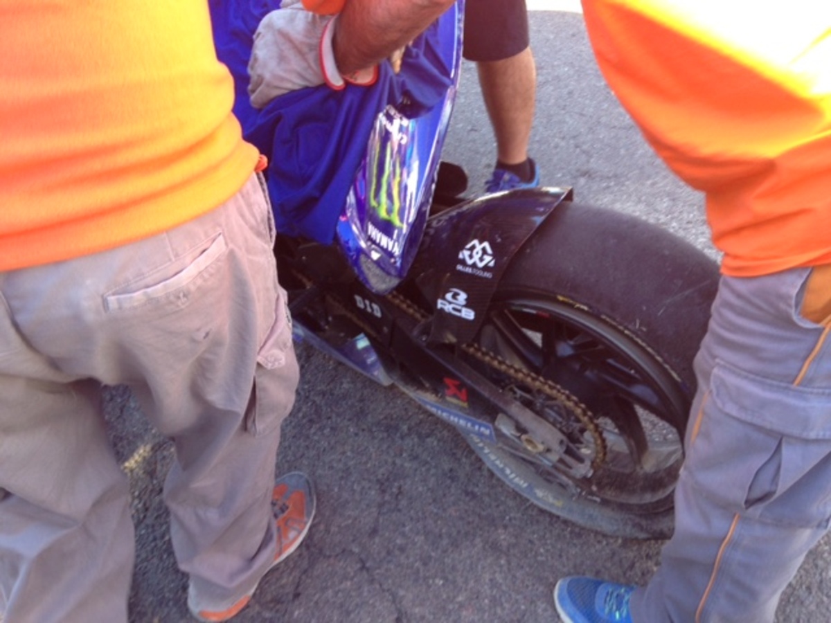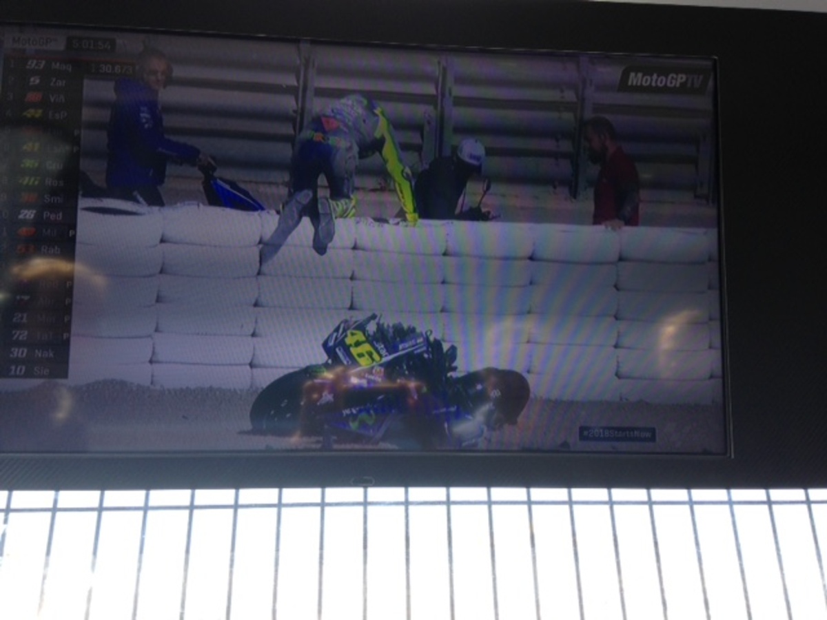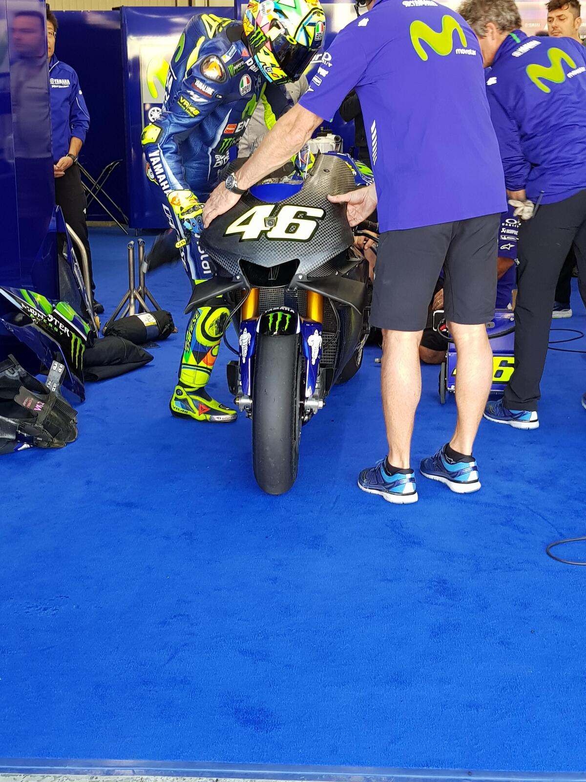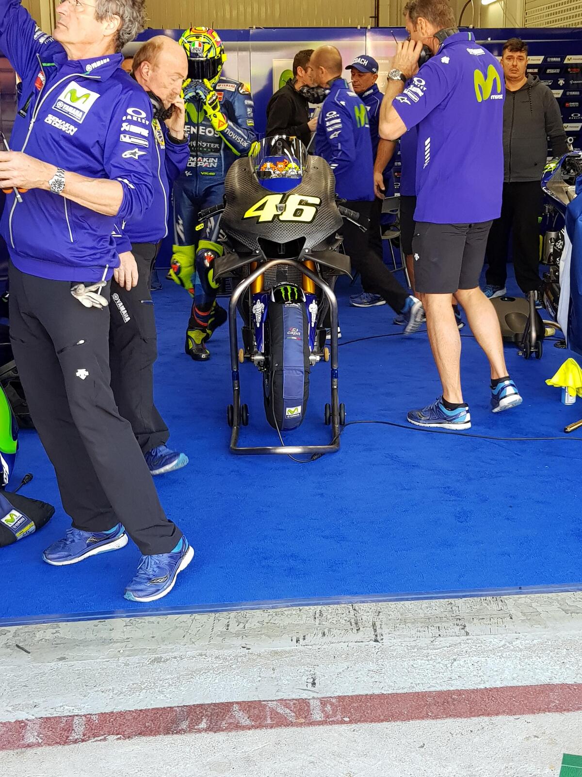 Rossi torna ai box, parla con i tecnici, la tuta è completamente segnata. Intanto zarco con la 2017 è secondo e primo pilota Yamaha