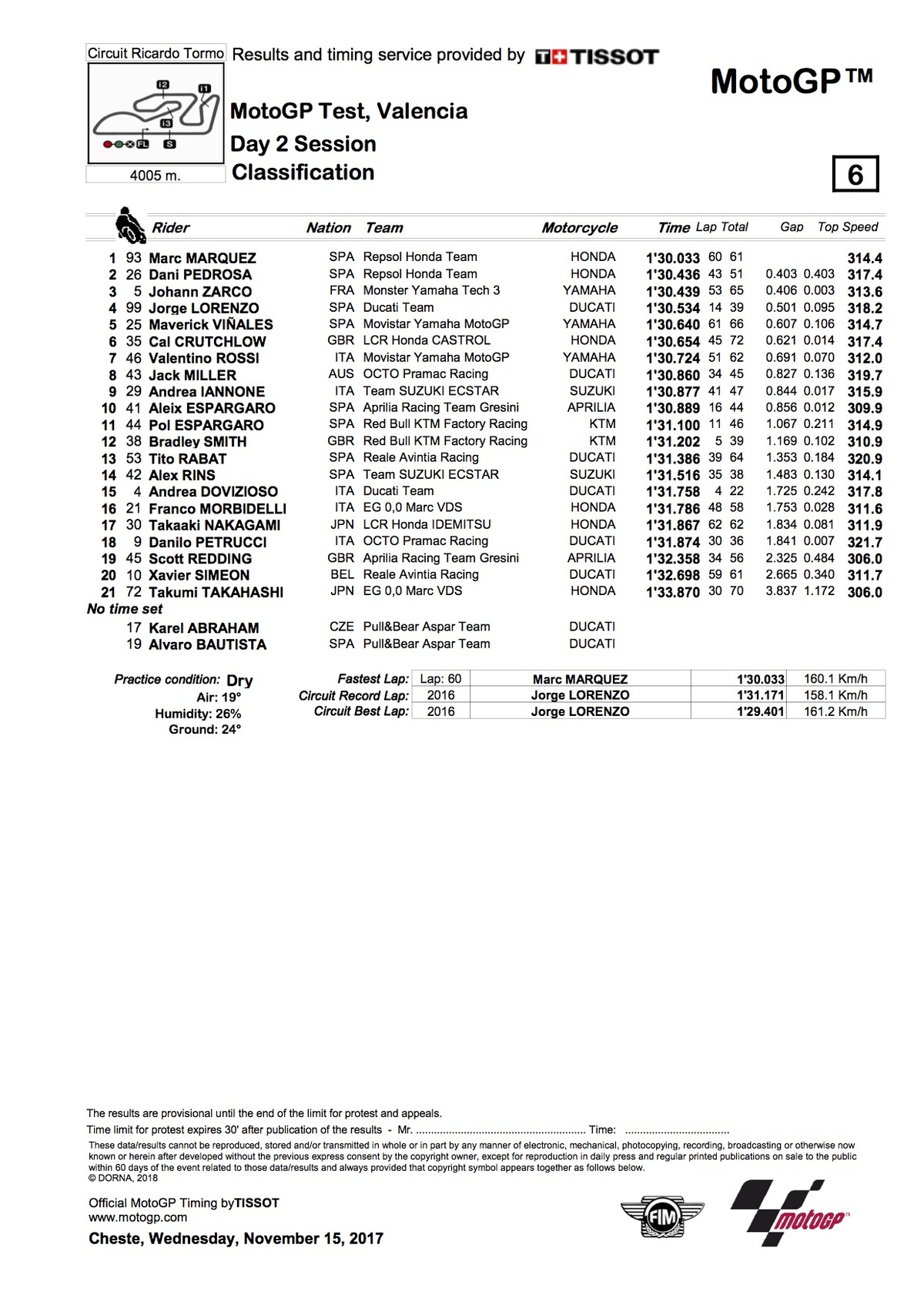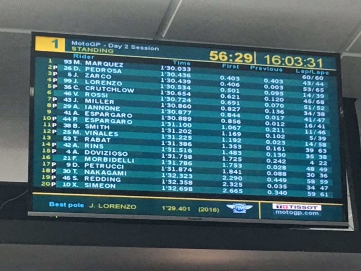 Marquez 1’30”673, zarco 1’31”227, vinales 1’31”306 p.espargaro 1’31”446, pedrosa 1’31”506, lorenzo 1’31”586, a.espargaro 1’31”644 dovizioso 1’31”647 crutchlow 1’31”685 rossi 1’31”782.