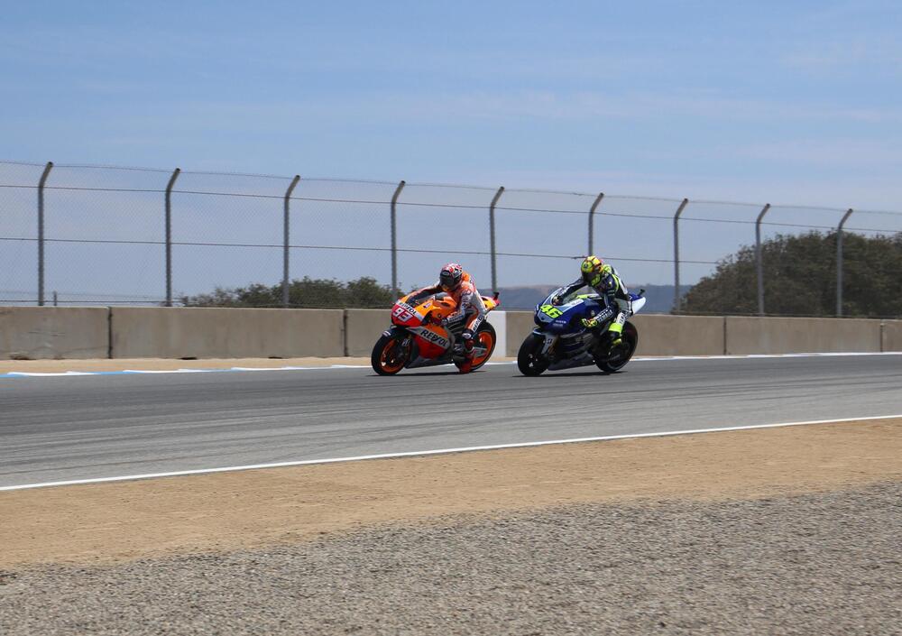 Warmup, giro d'allineamento, gara, uno scatto dopo l'altro. Il problema, come ben potete immaginare, è che pur cambiando un po' posto e prospettiva, il servizio risulta leggermente monotono. Quindi, dopo tre giri, mi sposto dall'altra parte della cabina dei commissari. Perdo la vista sul Corkscrew, prendo la staccata dopo la curva sette. Alla tornata successiva, dopo Bradl, arrivano Rossi e Marquez praticamente appaiati. Marc all'esterno, Vale all'interno. Scatto a raffica, prendo la sequenza, li tengo fino alla cabina, dopodiché sento il boato della folla e... so di essermi perso qualcosa di epocale. Torno di corsa dov'ero prima, dove trovo il "Canz", Carlo Canzano, che mi racconta cos'è successo. E giustamente mi sfotte per un paio d'ore quando scopre che me lo sono perso.