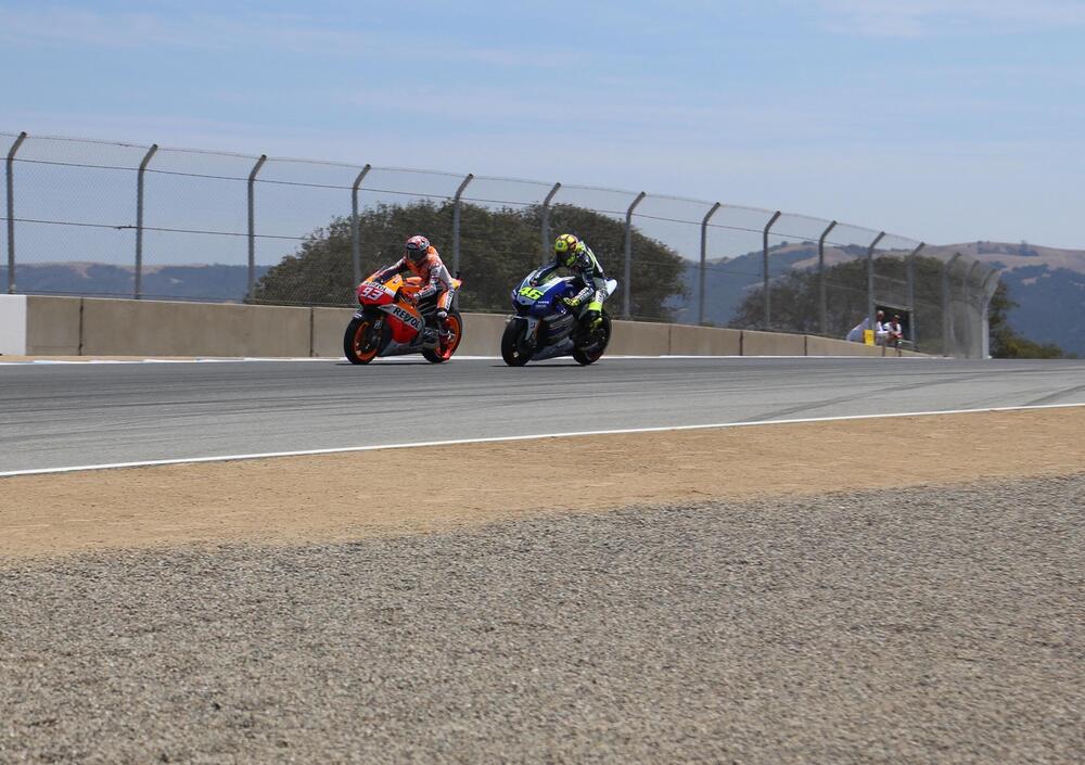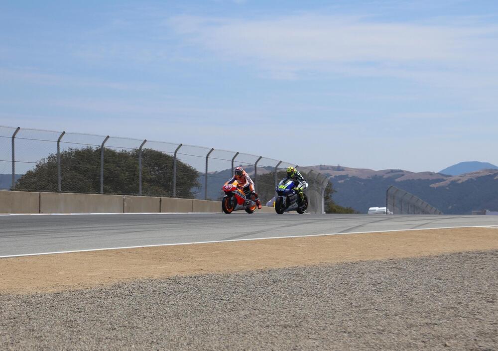 Insomma, all'arrivo al Cavatappi è davanti Marquez. Però alla otto, il Corkscrew appunto, l'interno ce l'ha Rossi, che tenta di ripassare in frenata e si riaffianca a Marquez. Inserisce, riguadagna terreno fino alla corda, poi Marquez "tira dritto" sulla via di fuga e chiude quello che il commento inglese alla gara chiama, giustamente, "A Valentino Rossi Memorial".