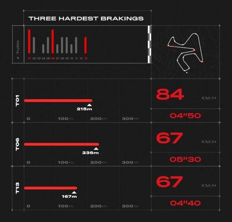 Delle 11 frenate due sono classificate come impegnative per i freni, sei sono di media difficoltà, mentre le restanti tre hanno un’incidenza leggera sugli impianti frenanti.