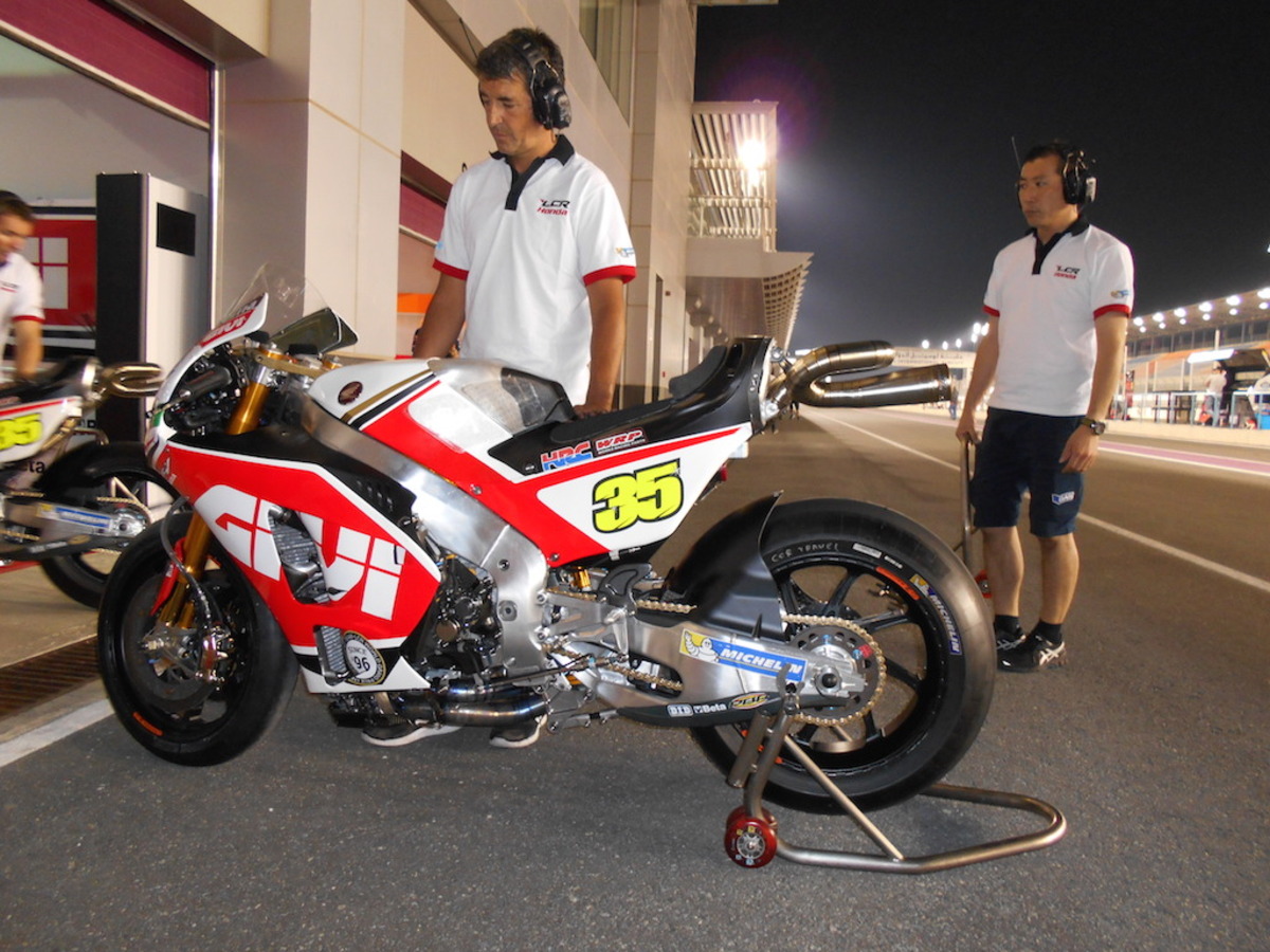 I tecnici del team LCR scaldano nella pit lane la RC213V di Crutchlow. Màrquez 1° in 1’56”616, davanti a Iannone (1’58”042) e Dovizioso (1’58”121). Rossi è tornato in pista dopo l'innocua scivolata