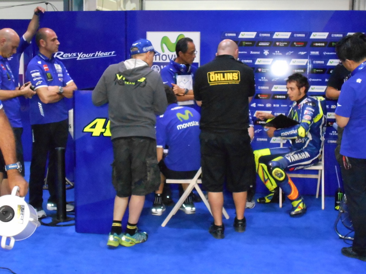 Mentre Lorenzo sale al 2° posto in 1’57”426 a 0”422 da Iannone, Valentino Rossi spiega ai tecnici quanto riscontrato nell’ultima uscita. Di spalle, con la felpa grigia VR46, Luca Cadalora ascolta attentamente le parole di Rossi