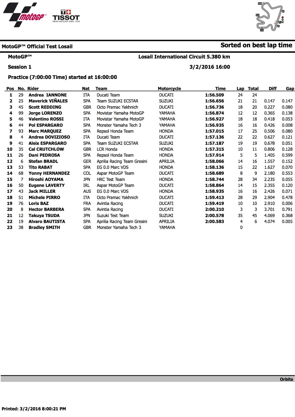 Lorenzo è nettamente il più veloce nella prima giornata di testa a Losail. Il secondo crono con un distacco di più di 4 decimi è Vinales che conferma l'ottimo "stato di salute" della Suzuki. Stesso tempo (0.014 di distacco) per Rossi che dopo la caduta alla curva 10 a inizio giornata, ha fatto 33 giri in totale. La prima Ducati è quella di Iannone con il quarto tempo. Il pilota italiano ha fatto "il tempone" all'ultimo giro dei 53 fatti oggi. Andrea è quello che ha fatto più chilometri oggi.