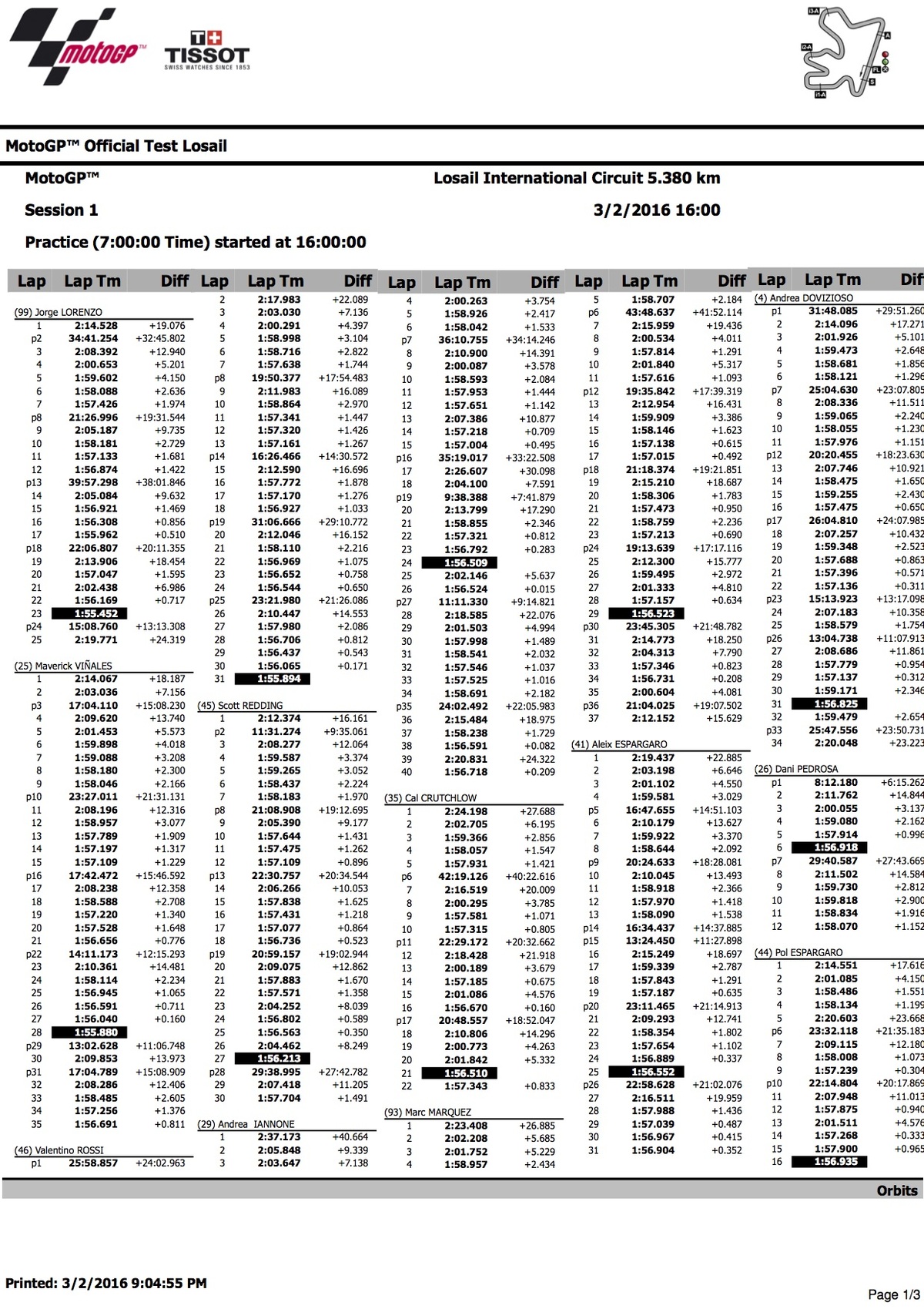 test finiti anche per lorenzo (1 in 1’55”452), Rossi (3 in 1’55”894), Marquez 10 in 1’56”523