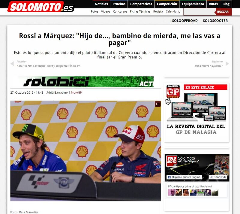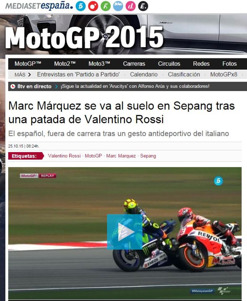 La portata del “fattaccio” di domenica, ovvero la collisione fra Valentino Rossi e Marc Marquez durante il Gran Premio di Sepang, ha ampiamente trasceso i confini mediatici che normalmente racchiudono le vicende del motociclismo. Così come da noi, anche in Spagna la vicenda è sulla bocca di tutti e sulle prime pagine di quotidiani e periodici.