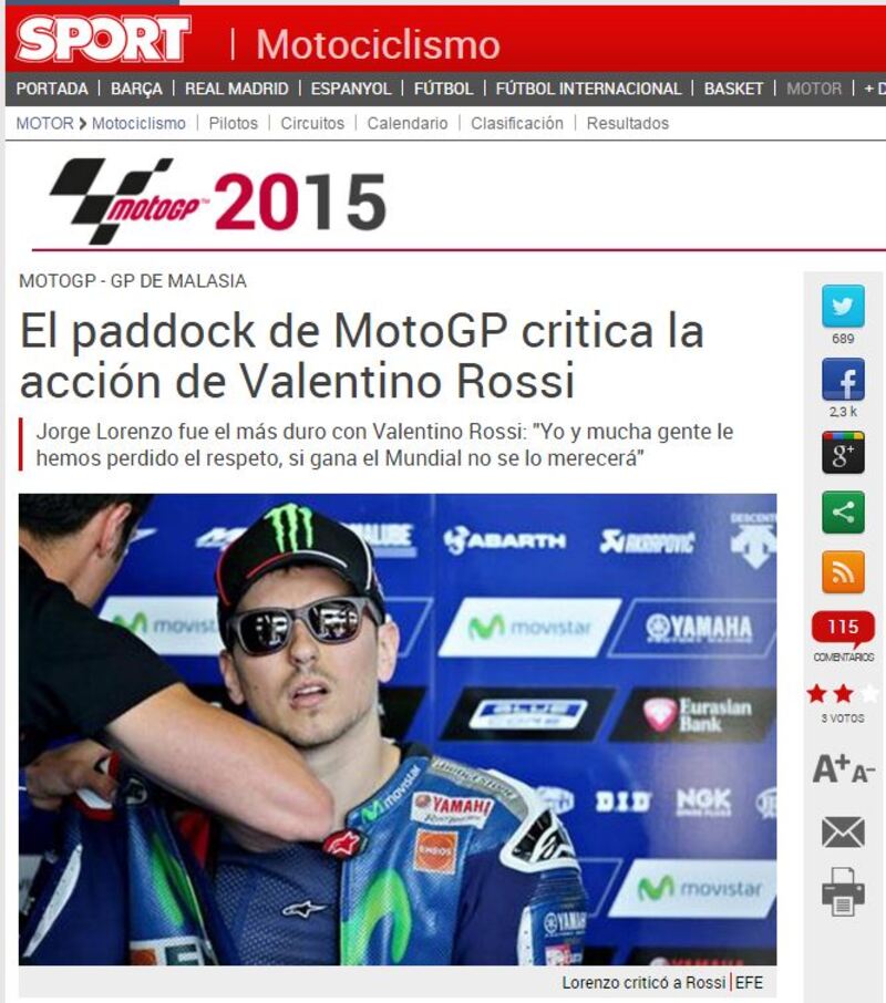 La testata riporta pareri per lo più negativi sull’azione di Rossi all’interno del paddock.
