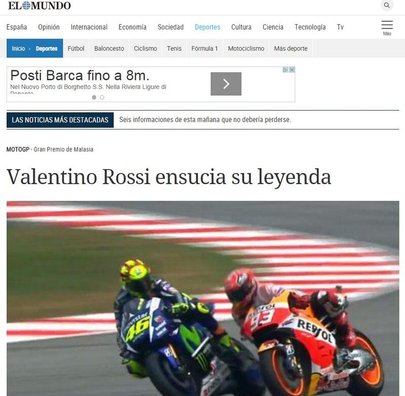 “Rossi sporca la sua leggenda”, apertura che identifica in maniera inequivocabile la posizione del quotidiano generalista spagnolo.