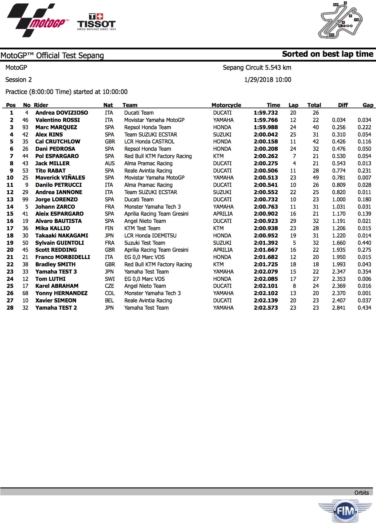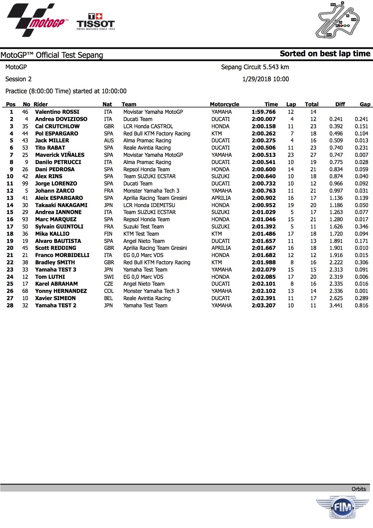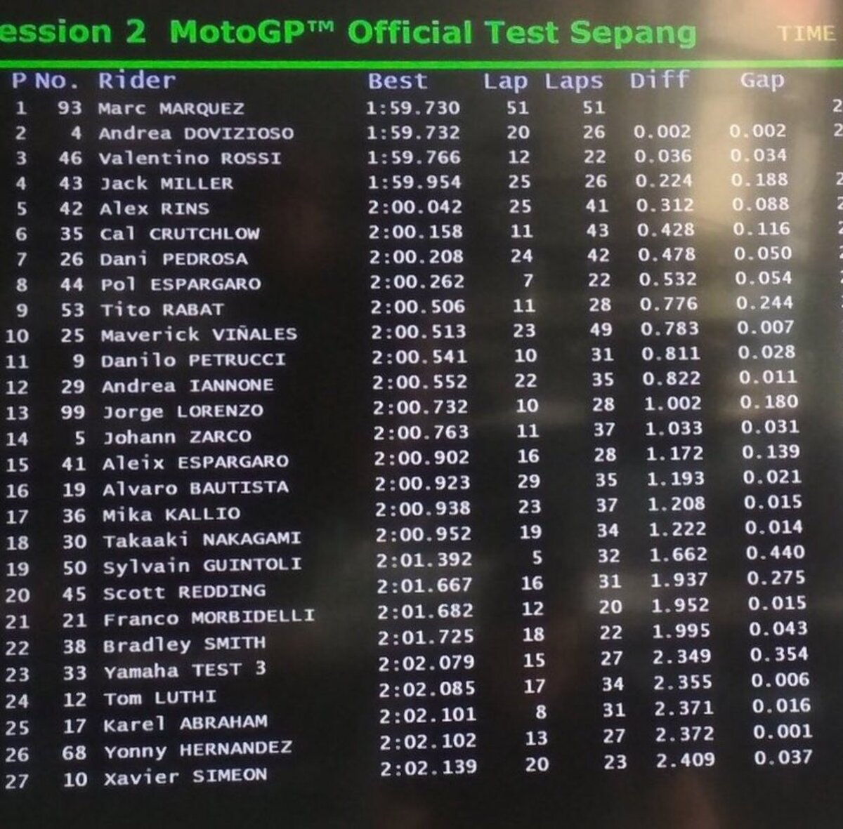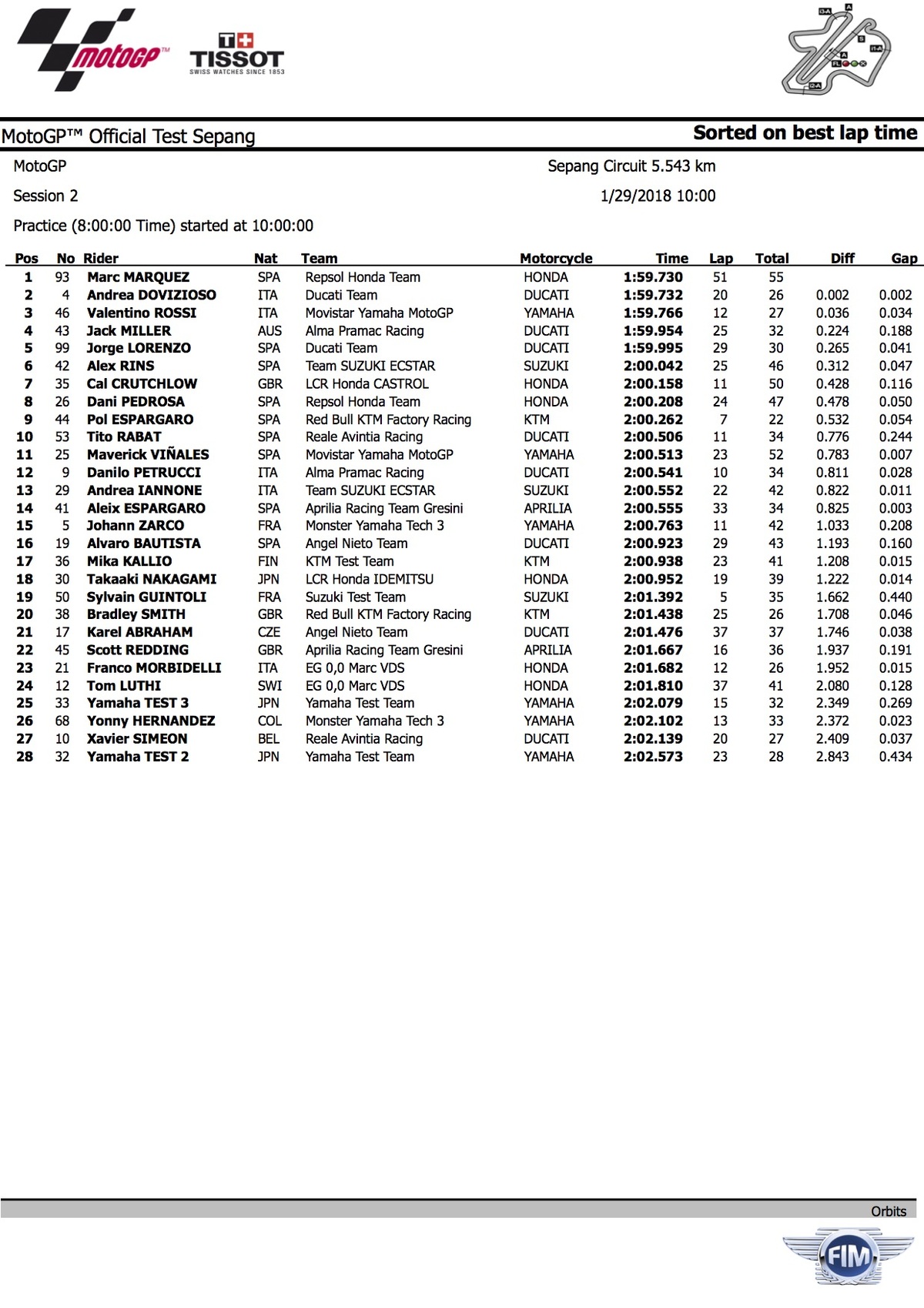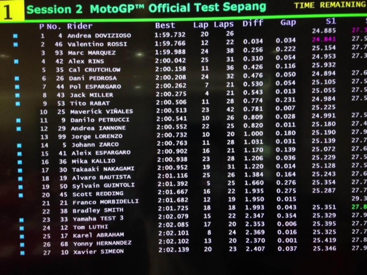 Al momento, ogni considerazione è inutile: si è girato troppo poco con la pista in buone condizioni. Solo un paio di appunti, tutti da verificare: l’approccio di Mavericks Vinales sembra molto diverso da quello del 2017, meno istintivo, ma più ragionato; la Suzuki sembra ripartire da dove aveva finito nel 2016, quindi in crescita.
