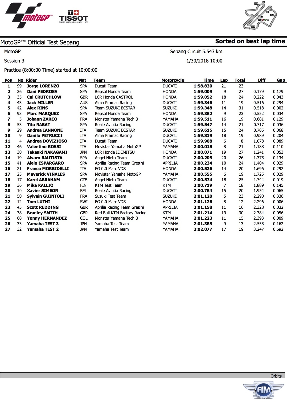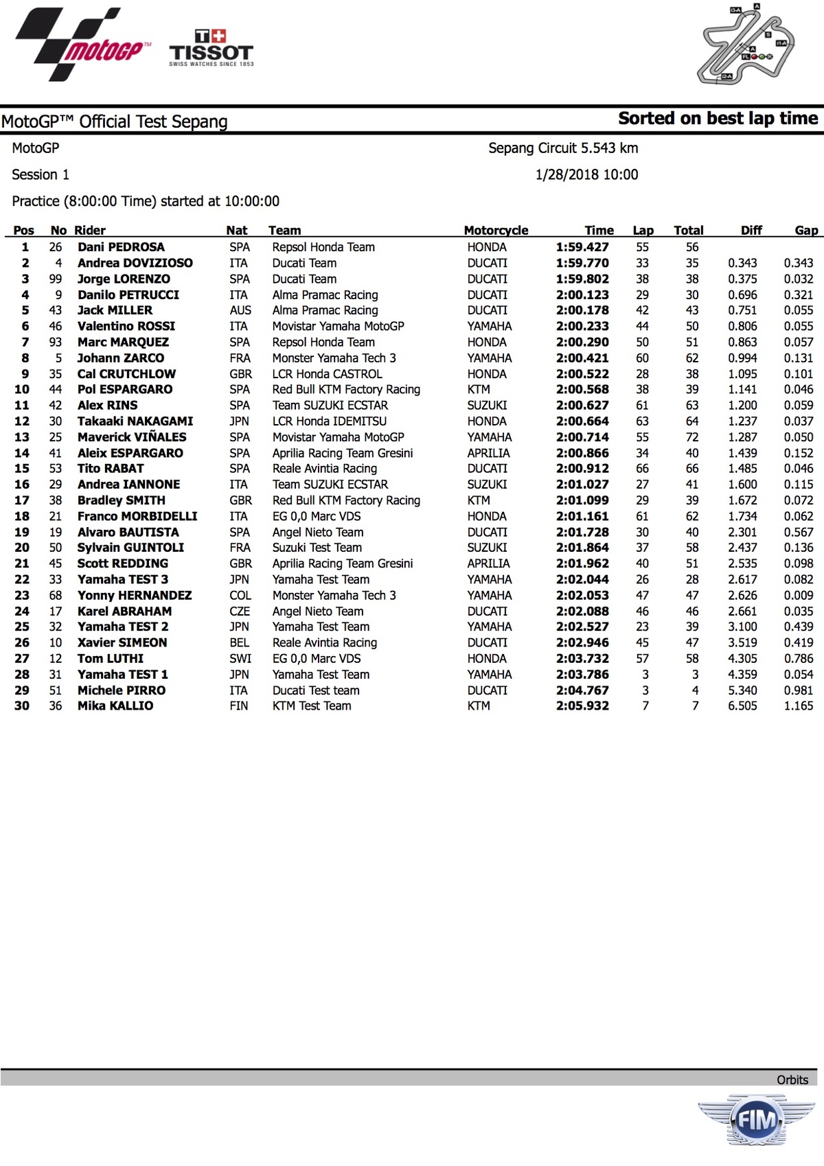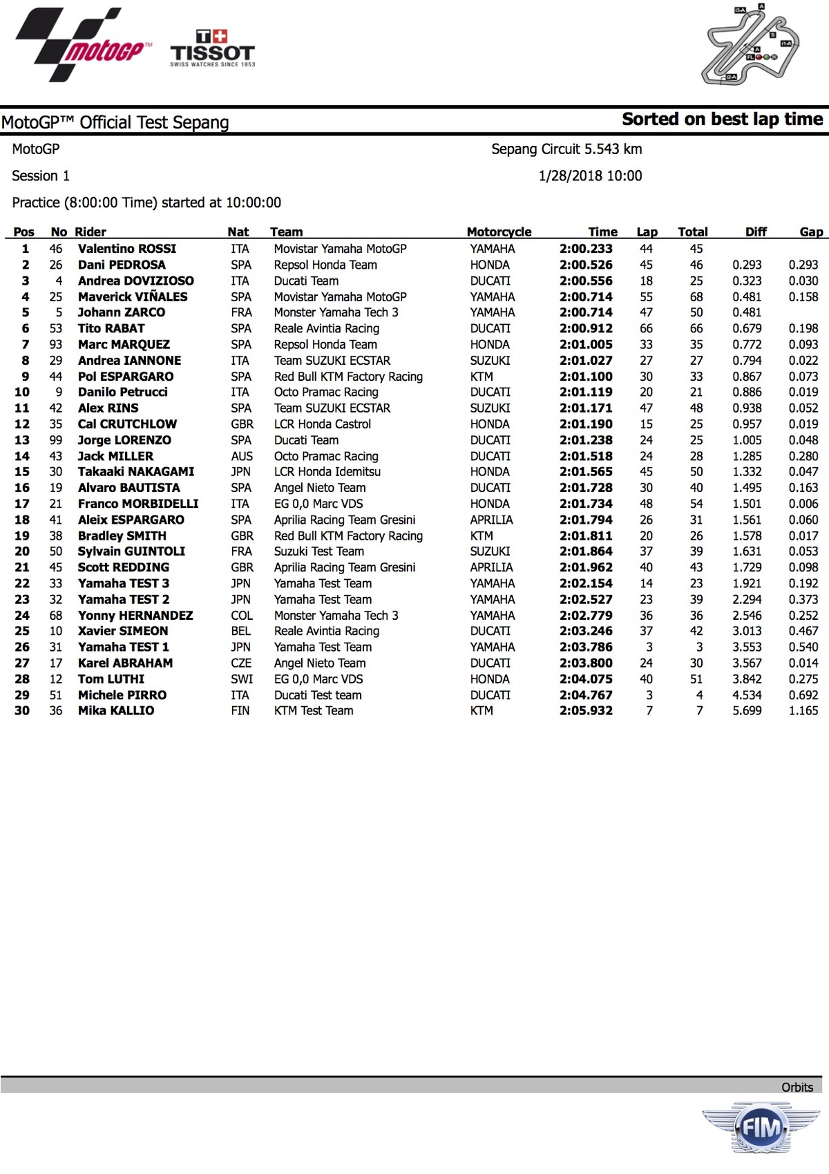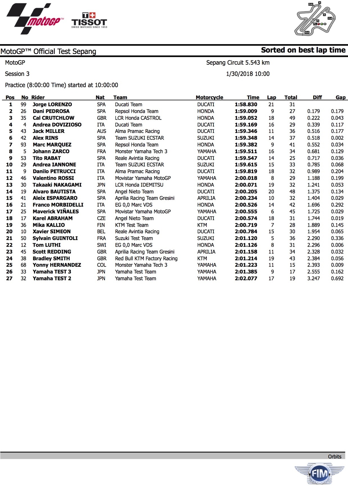 Al momento, ogni considerazione è inutile: si è girato troppo poco con la pista in buone condizioni. Solo un paio di appunti, tutti da verificare: l’approccio di Mavericks Vinales sembra molto diverso da quello del 2017, meno istintivo, ma più ragionato; la Suzuki sembra ripartire da dove aveva finito nel 2016, quindi in crescita.