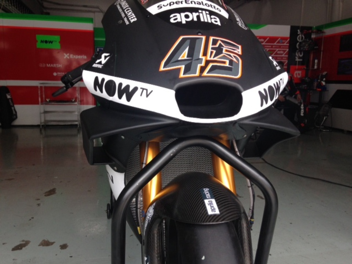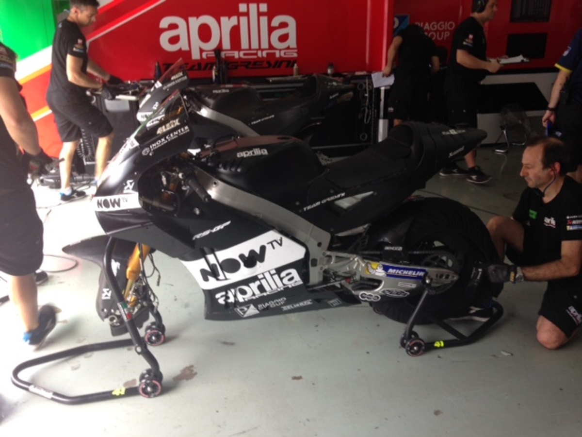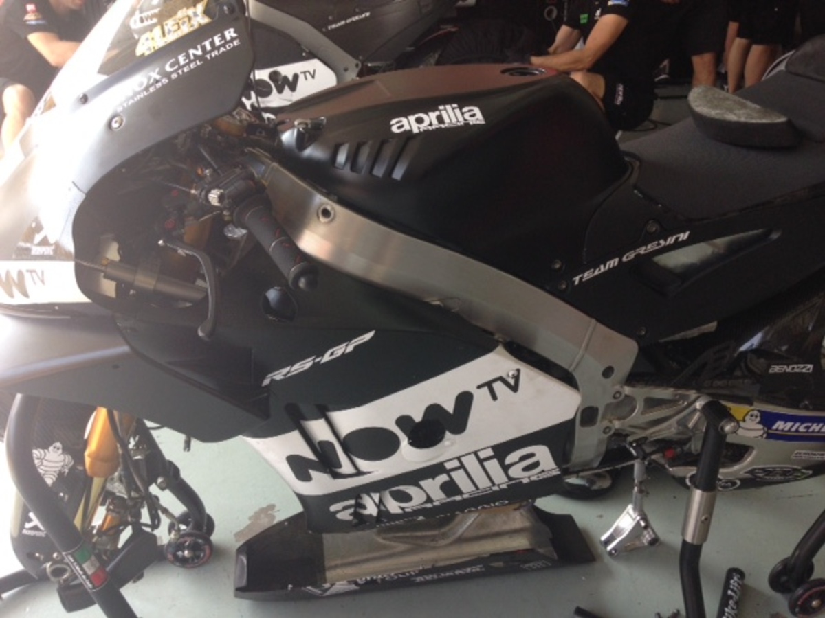 Espargaro esce con la nuova Aprilia, riconoscibile dal telaio con lo "spigolo". È anche più grande, nel complesso