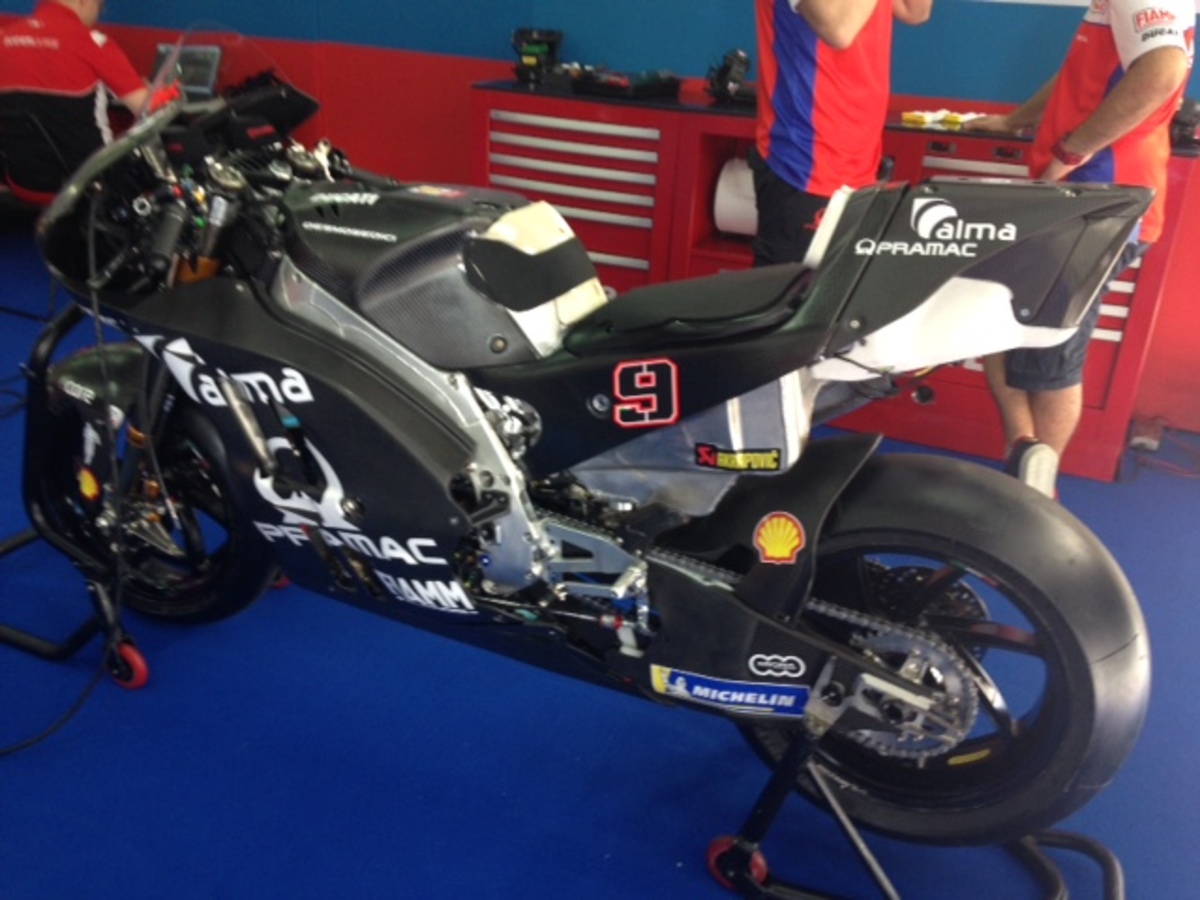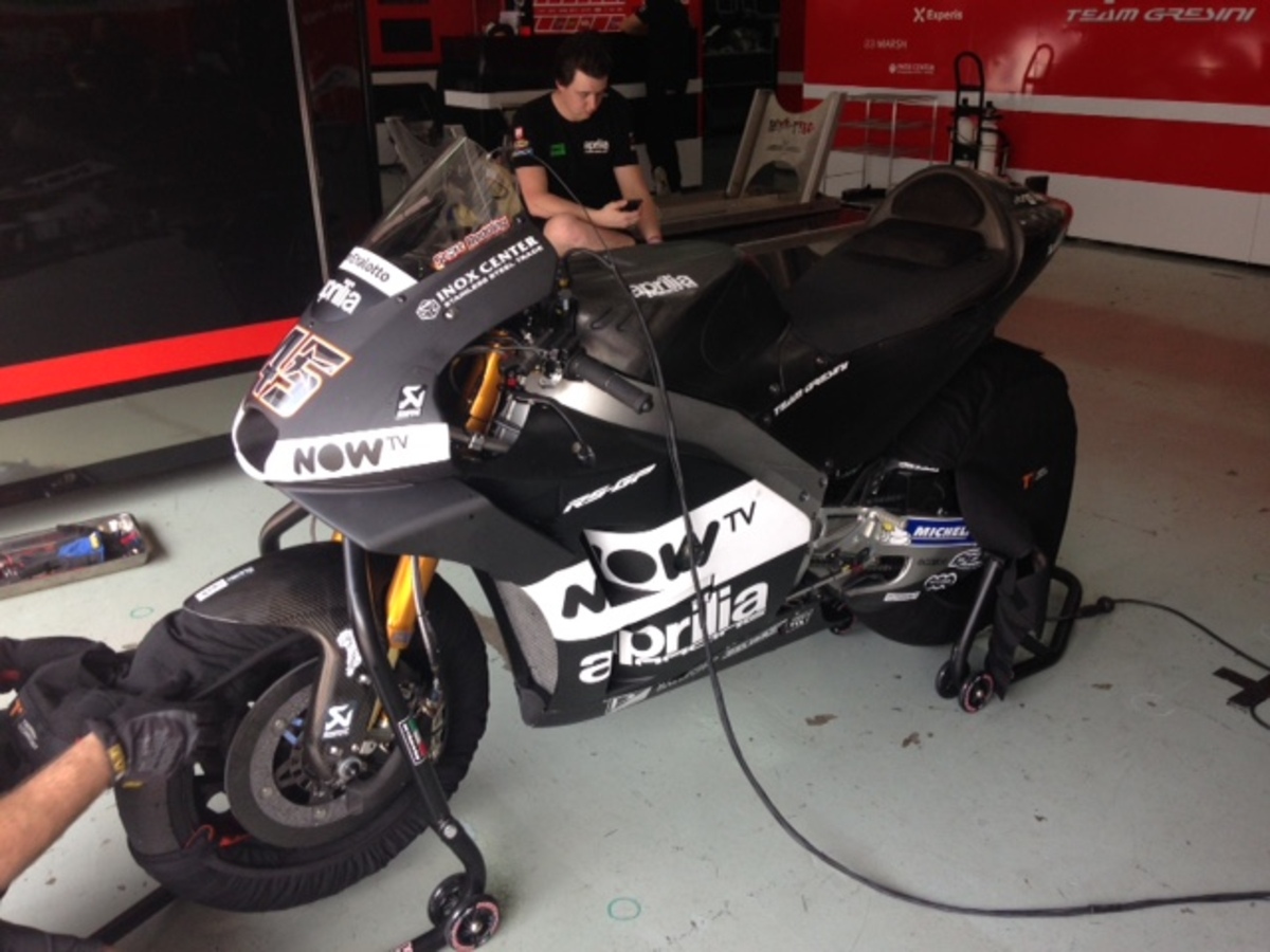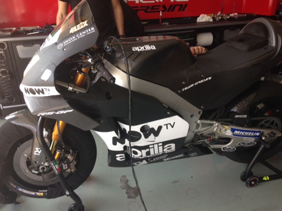 Espargaro esce con la nuova Aprilia, riconoscibile dal telaio con lo "spigolo". È anche più grande, nel complesso