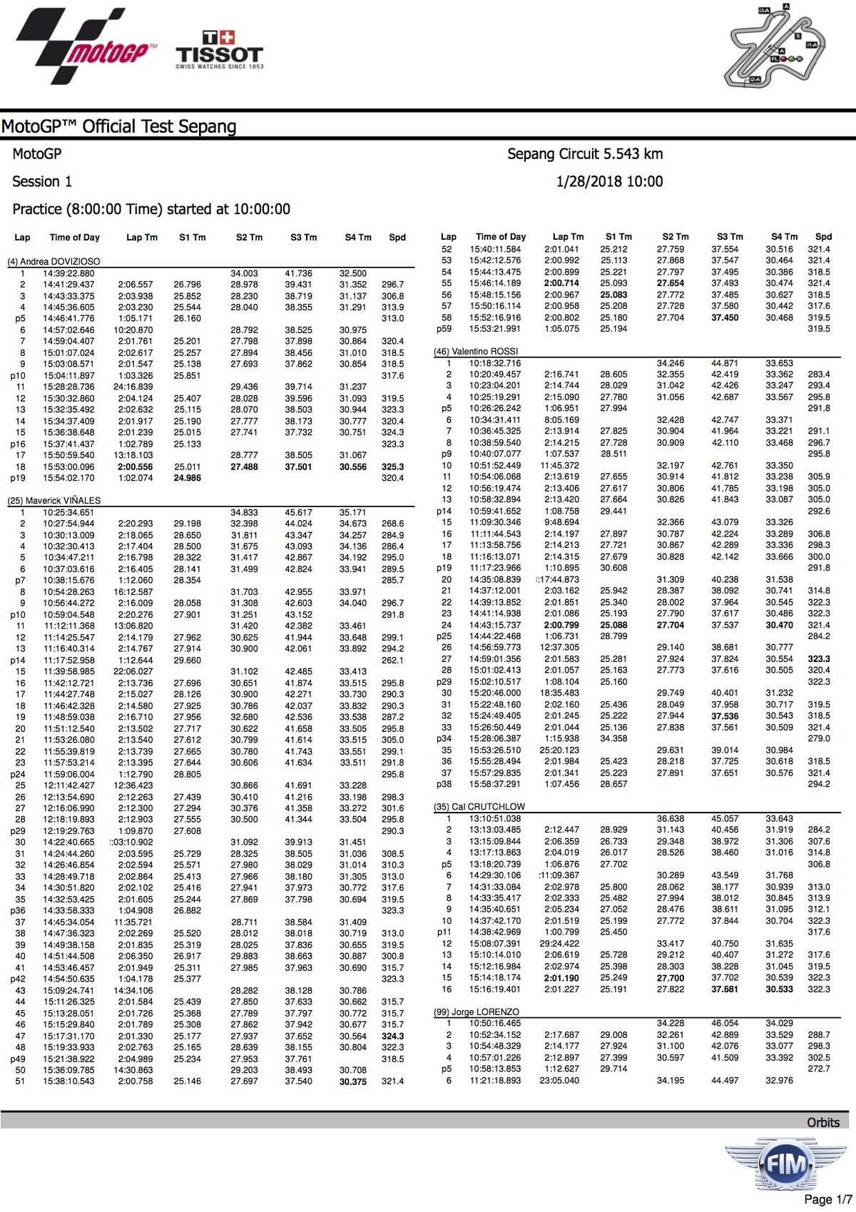 Dovizioso è stato il più veloce nel T1 (24”986), nel T2 (27”488), mentre nel T3, fino adesso, il più veloce è stato Vinales (37”450), riferimento anche nel T4 (30”375)