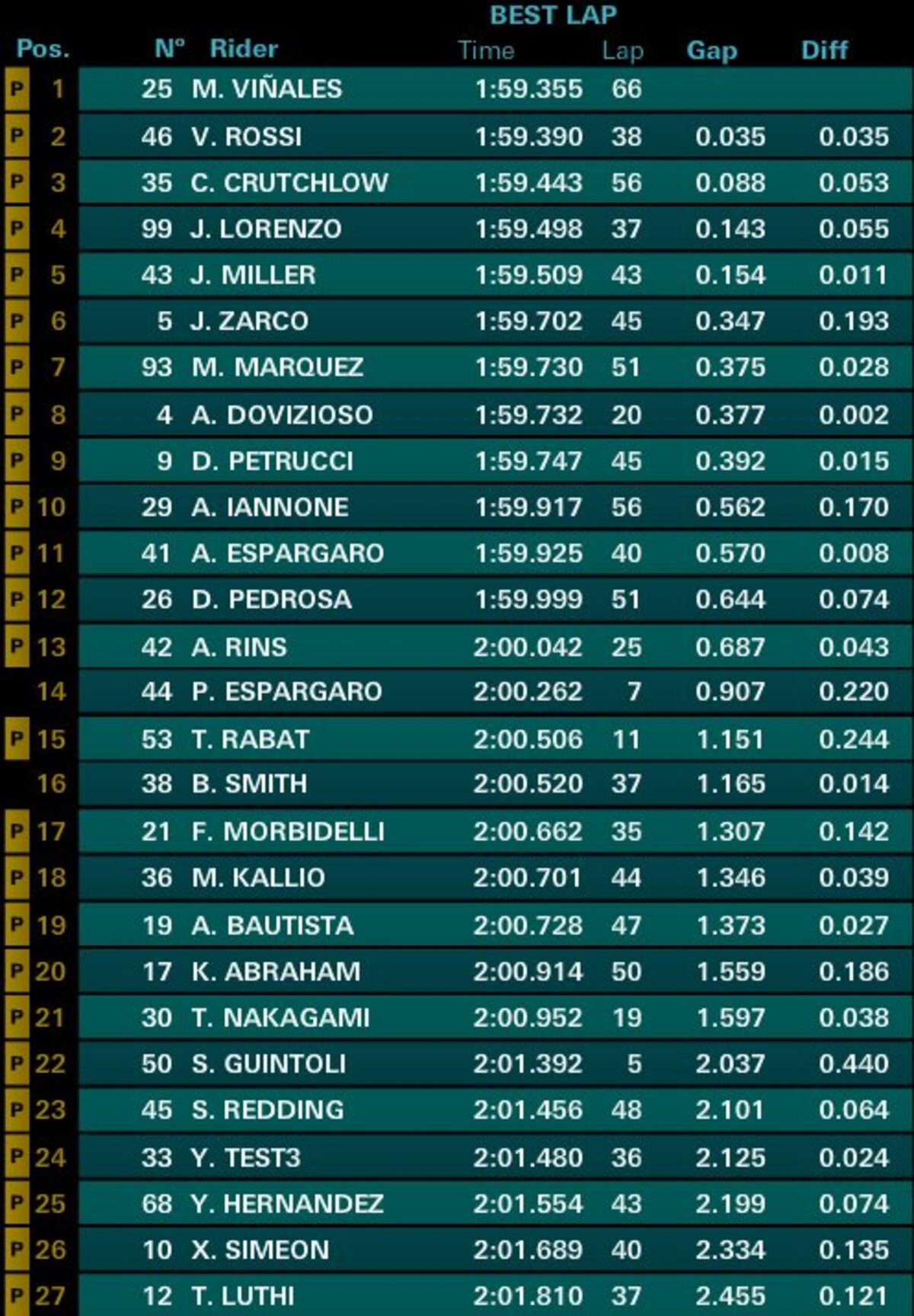 Ed ecco il miglior tempo di vinales in 2’00”758, 0”041 più veloce del compagno di squadra.