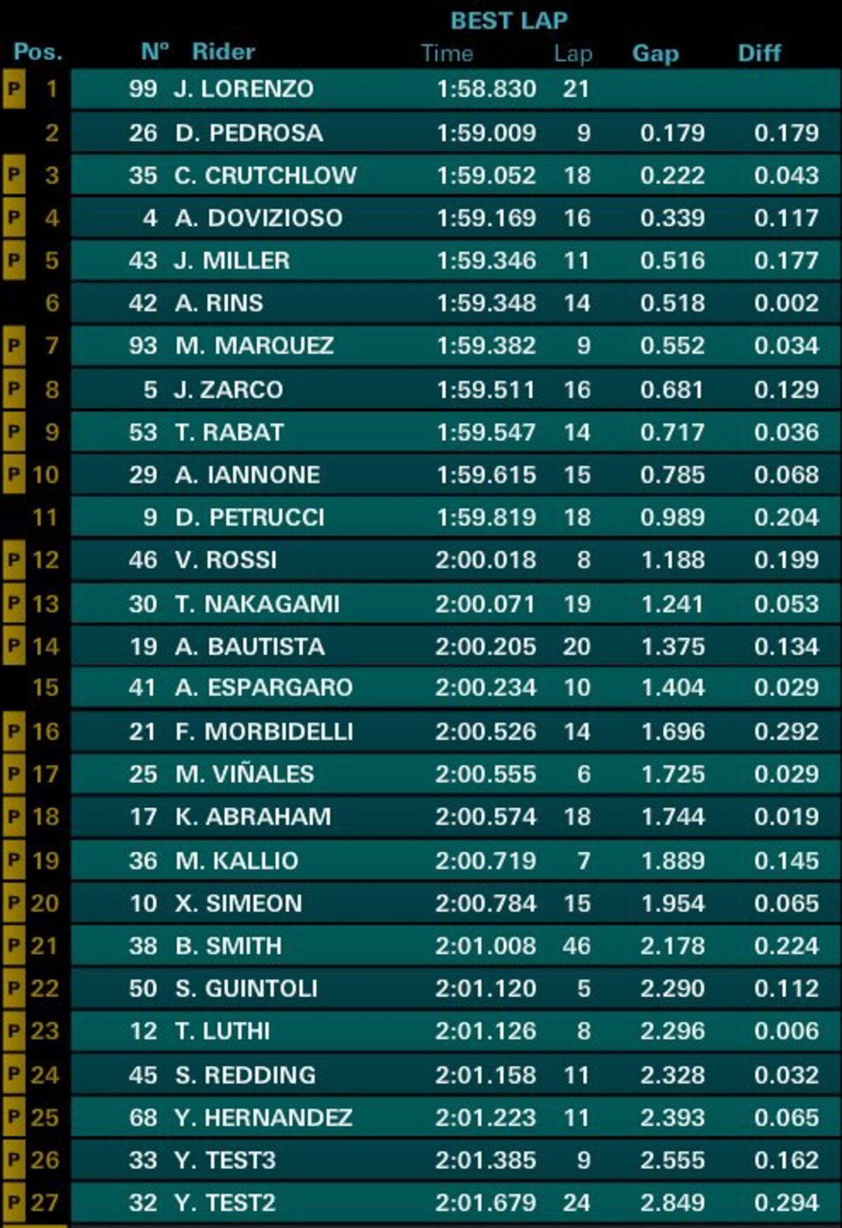 - Per il momento, le Yamaha ufficiali sembrano faticare. Vinales però è entrato in pista tardi e rossi non pare aver provato il “time attack”. Aspetteranno questa sera?
