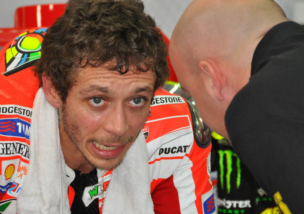 Valentino Rossi ha chiuso solo ottavo a 1”484, a un decimo da Nicky Hayden, sesto. Valentino non si è risparmiato in questa prima giornata di prove: è stato il primo a scendere in pista, è stato tra i pochissimi (e anche in questo caso il primo) a girare con le gomme da bagnato, cercando di sfruttare ogni secondo di una giornata più corta del previsto. In Casa Ducati si è partiti naturalmente dalla configurazione dell’ultimo giorno del precedente test, con Valentino ancora impegnato a cercare la posizione di guida ideale, utilizzando anche una differente taratura di elettronica. Rispetto al primo giorno dei primi test, Rossi ha girato un secondo più lento - quindi più o meno in linea con quanto fatto da Lorenzo -, ma fa comunque specie che sia dietro ad Hayden, che tornava in sella dopo essere stato operato alla spalla sinistra.