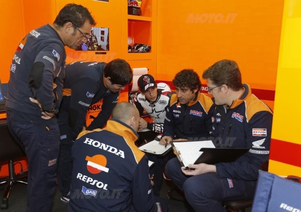 Valentino Rossi continua a inanellare giri (28, 1’43”735 il più rapido), mentre Andrea Dovizioso continua a parlare con i tecnici, Marc Marquez incontra i giornalisti all’interno del box Honda. Tuta bianca e colori HRC, come per la carenatura della moto, Marquez, dopo Rossi, è la vera star di questi test: impressionante quanti giornalisti, fotografi, telecamere si siano dati appuntamento in quello che, fino a domenica, era l’angolo di Casey Stoner.